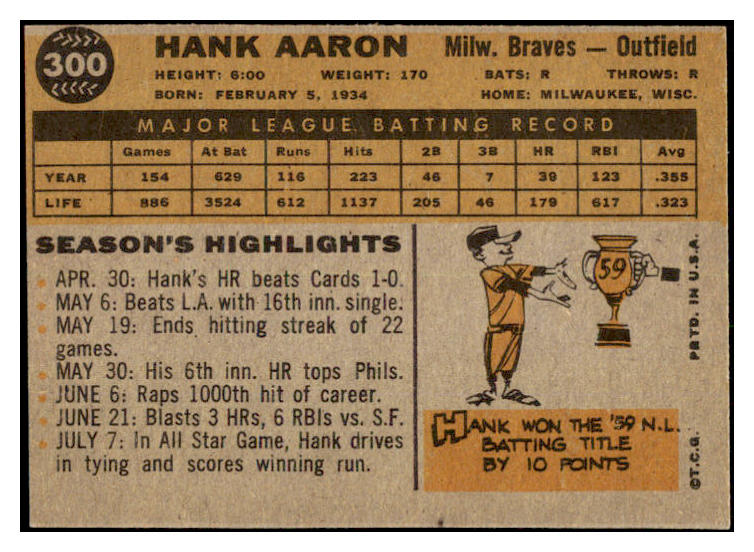 1960 Topps Baseball #300 Hank Aaron Braves VG-EX 527403