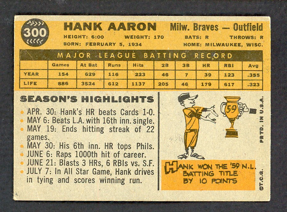 1960 Topps Baseball #300 Hank Aaron Braves VG-EX 543300