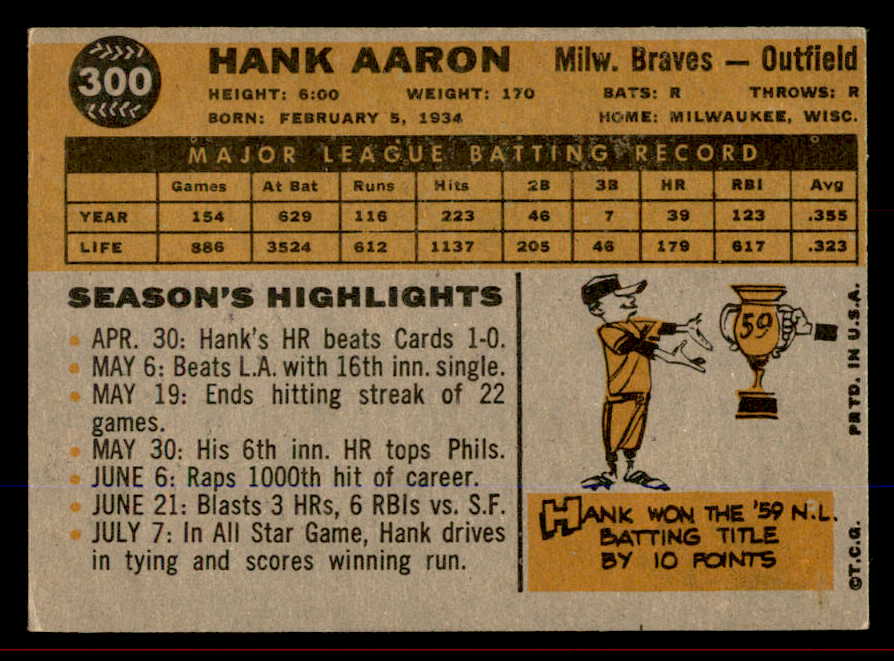 1960 Topps Baseball #300 Hank Aaron Braves VG-EX 545511