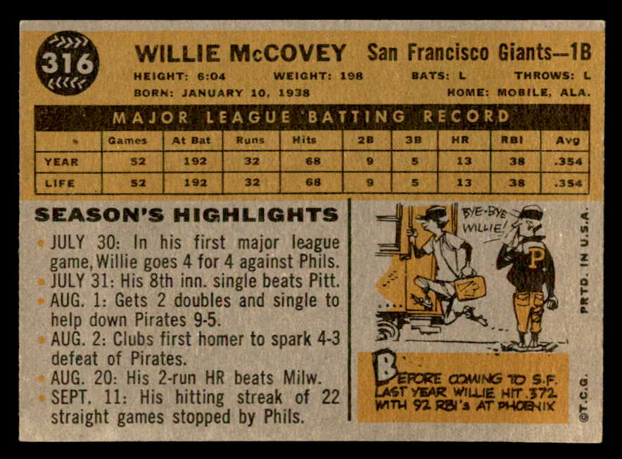 1960 Topps Baseball #316 Willie McCovey Giants EX 538989