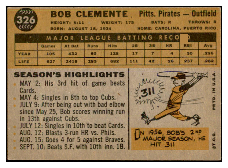 1960 Topps Baseball #326 Roberto Clemente Pirates VG 537401