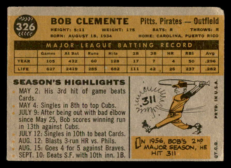1960 Topps Baseball #326 Roberto Clemente Pirates VG 540218