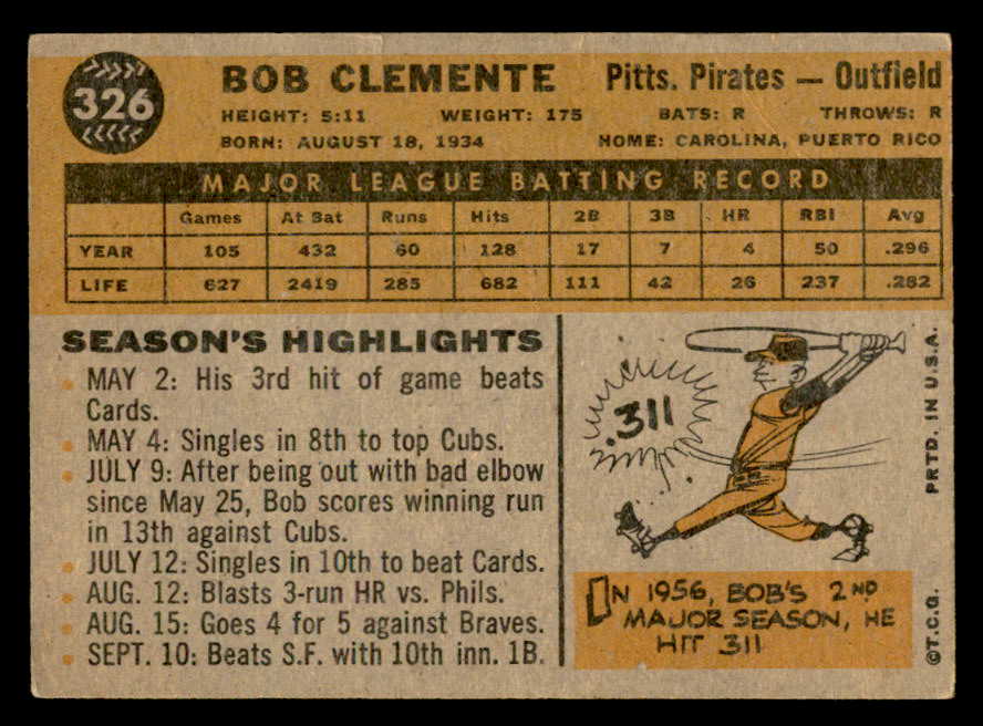 1960 Topps Baseball #326 Roberto Clemente Pirates VG 540219