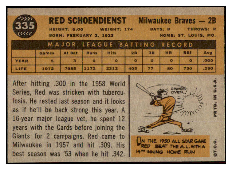 1960 Topps Baseball #335 Red Schoendienst Braves EX-MT 525429