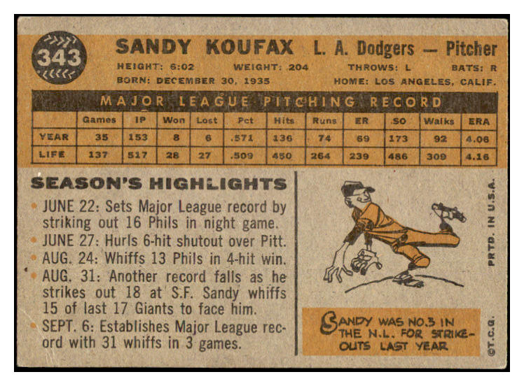 1960 Topps Baseball #343 Sandy Koufax Dodgers VG-EX corner crease 525606