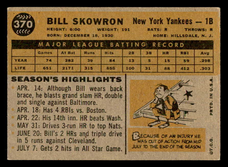 1960 Topps Baseball #370 Bill Skowron Yankees EX 540262