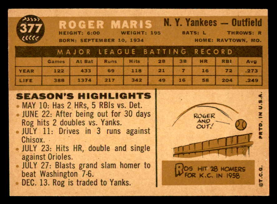 1960 Topps Baseball #377 Roger Maris Yankees EX-MT 538992
