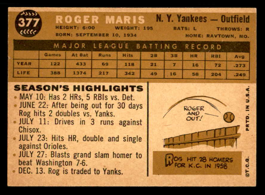 1960 Topps Baseball #377 Roger Maris Yankees EX-MT 539402