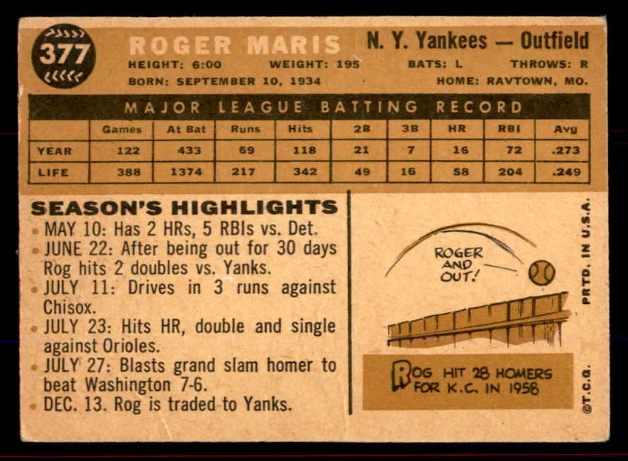 1960 Topps Baseball #377 Roger Maris Yankees VG 545754