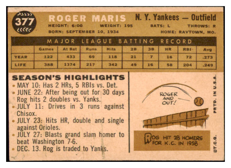 1960 Topps Baseball #377 Roger Maris Yankees VG-EX 529117