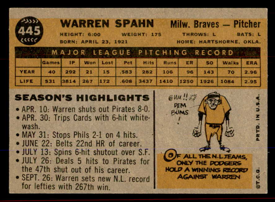 1960 Topps Baseball #445 Warren Spahn Braves EX-MT 545749