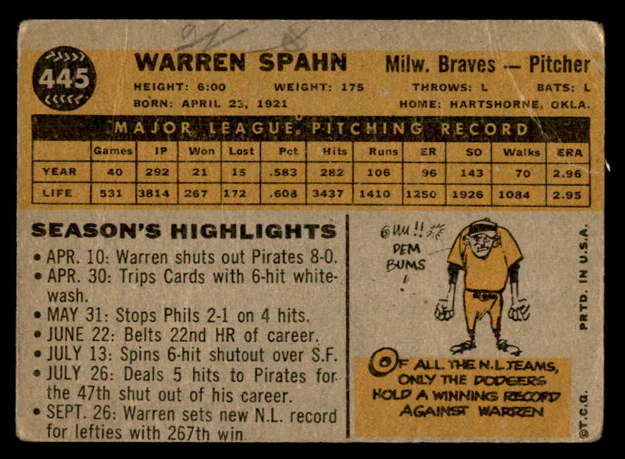 1960 Topps Baseball #445 Warren Spahn Braves FR-GD 540251