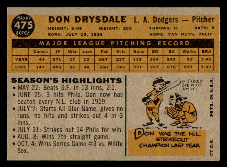 1960 Topps Baseball #475 Don Drysdale Dodgers EX+/EX-MT 539447