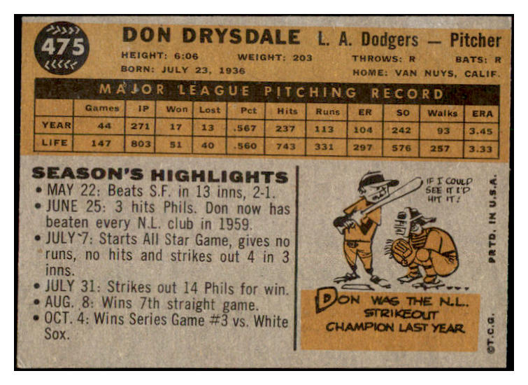 1960 Topps Baseball #475 Don Drysdale Dodgers EX-MT 529111