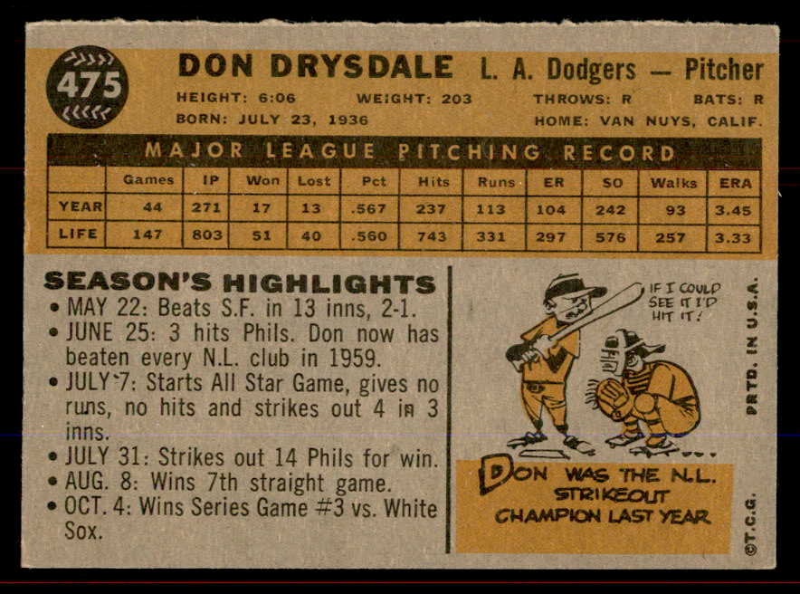 1960 Topps Baseball #475 Don Drysdale Dodgers EX-MT 545755