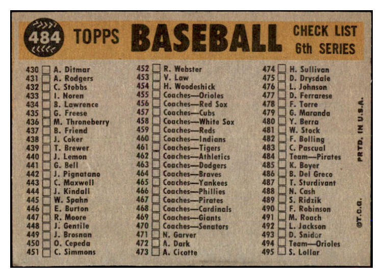 1960 Topps Baseball #484 Pittsburgh Pirates Team EX+/EX-MT 527536