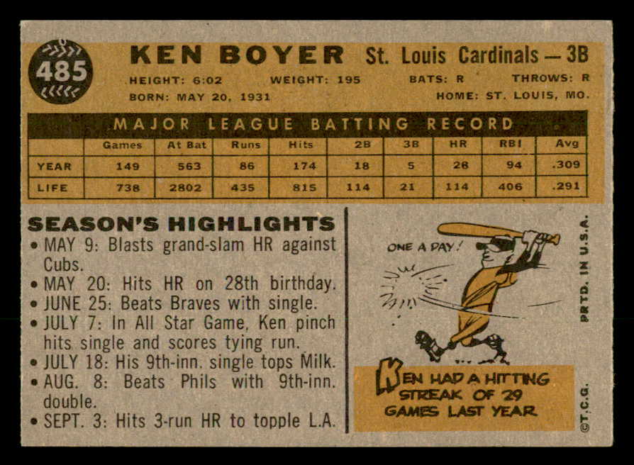 1960 Topps Baseball #485 Ken Boyer Cardinals EX-MT 540257