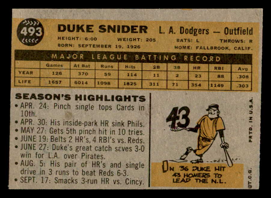 1960 Topps Baseball #493 Duke Snider Dodgers EX-MT 538753