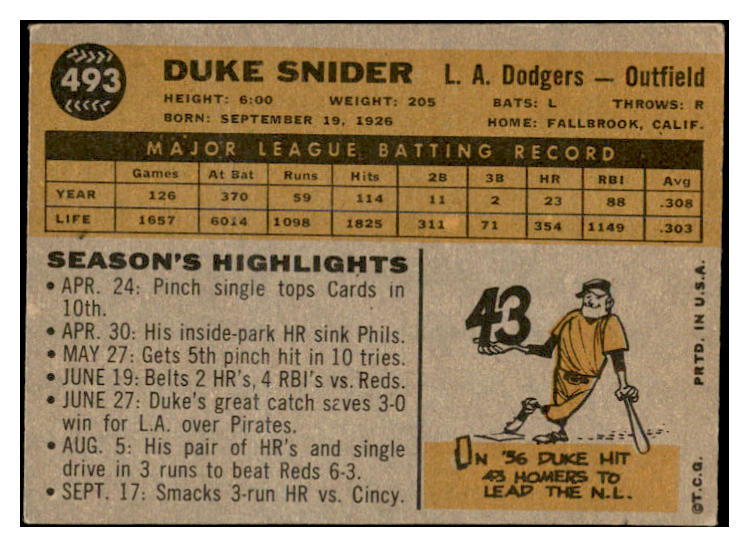 1960 Topps Baseball #493 Duke Snider Dodgers VG 536415