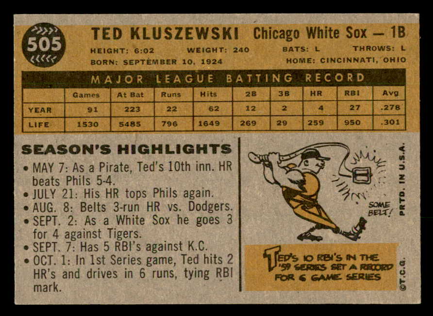 1960 Topps Baseball #505 Ted Kluszewski White Sox EX 540260