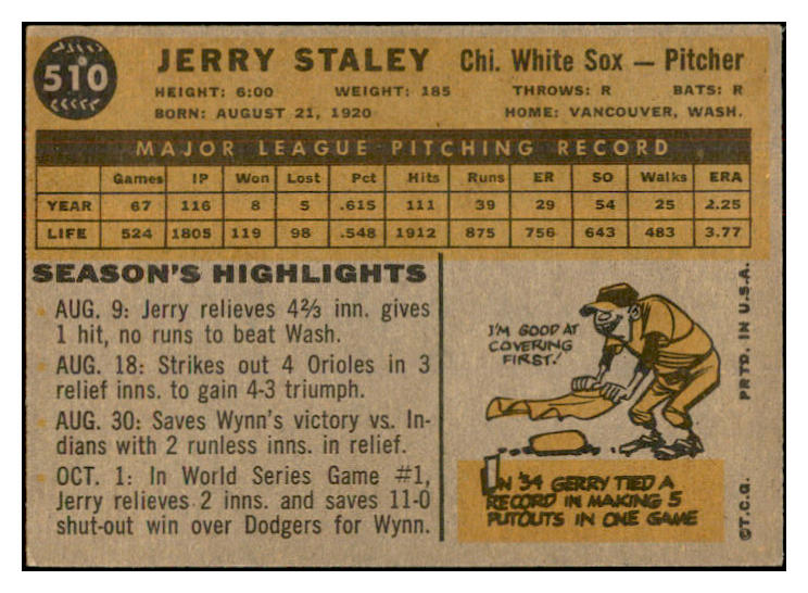 1960 Topps Baseball #510 Jerry Staley White Sox EX 534354