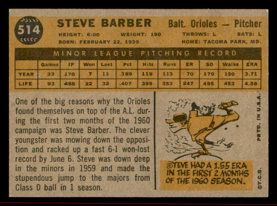 1960 Topps Baseball #514 Steve Barber Orioles VG-EX/EX 542724