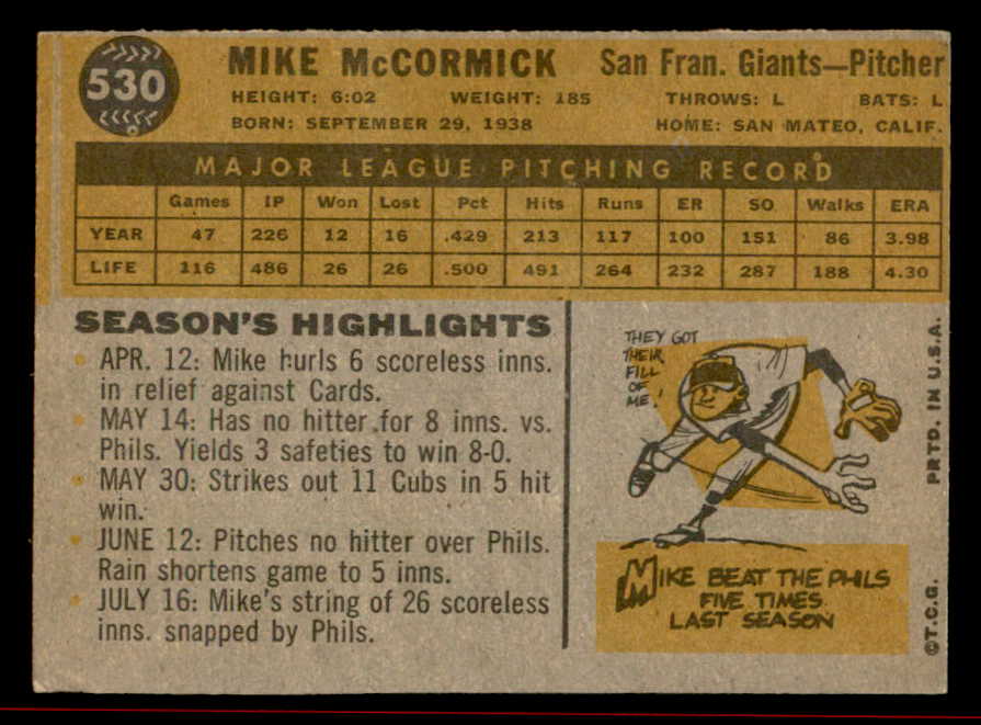 1960 Topps Baseball #530 Mike McCormick Giants VG-EX 542742