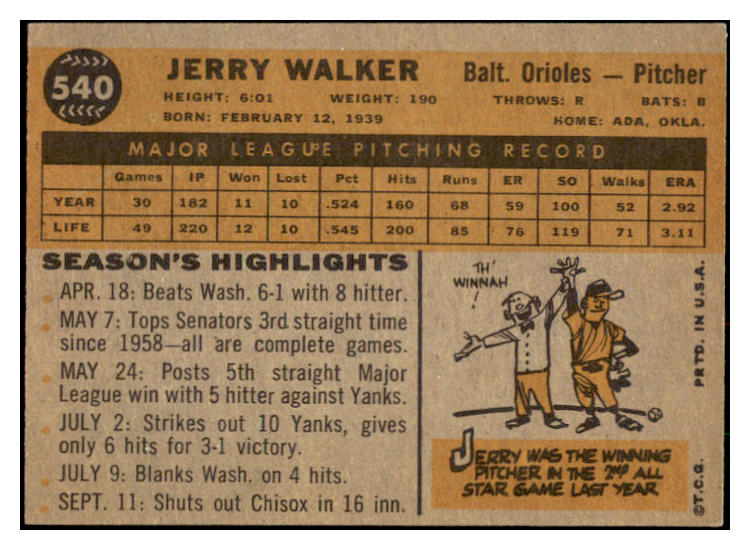 1960 Topps Baseball #540 Jerry Walker Orioles EX-MT 531209