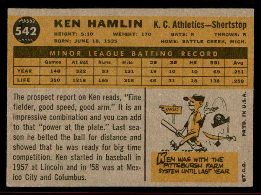 1960 Topps Baseball #542 Ken Hamlin A's EX-MT 542710