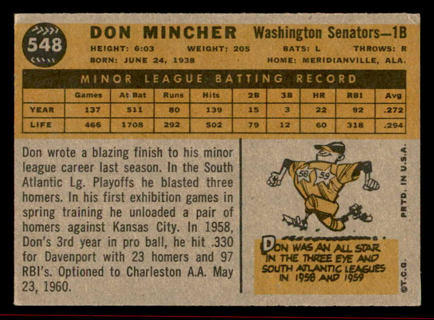 1960 Topps Baseball #548 Don Mincher Senators VG-EX 542758