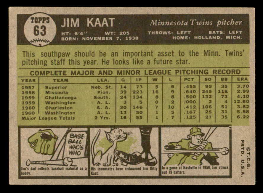 1961 Topps Baseball #063 Jim Kaat Twins EX-MT 540312