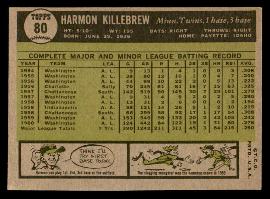 1961 Topps Baseball #080 Harmon Killebrew Twins VG-EX 540271