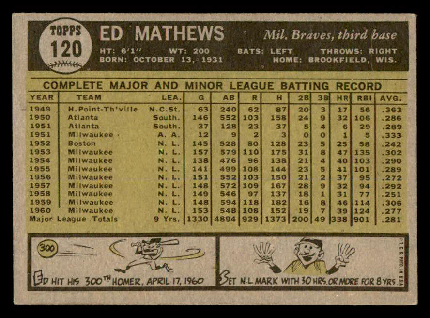 1961 Topps Baseball #120 Eddie Mathews Braves EX+/EX-MT 539381