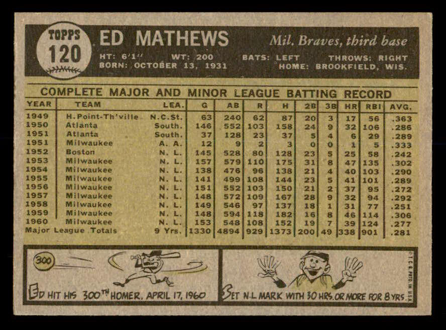 1961 Topps Baseball #120 Eddie Mathews Braves EX-MT 539577