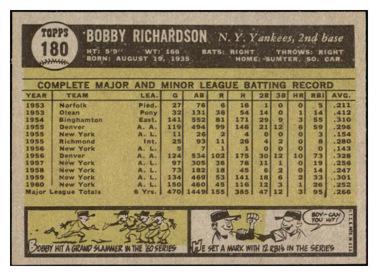 1961 Topps Baseball #180 Bobby Richardson Yankees EX-MT 525498