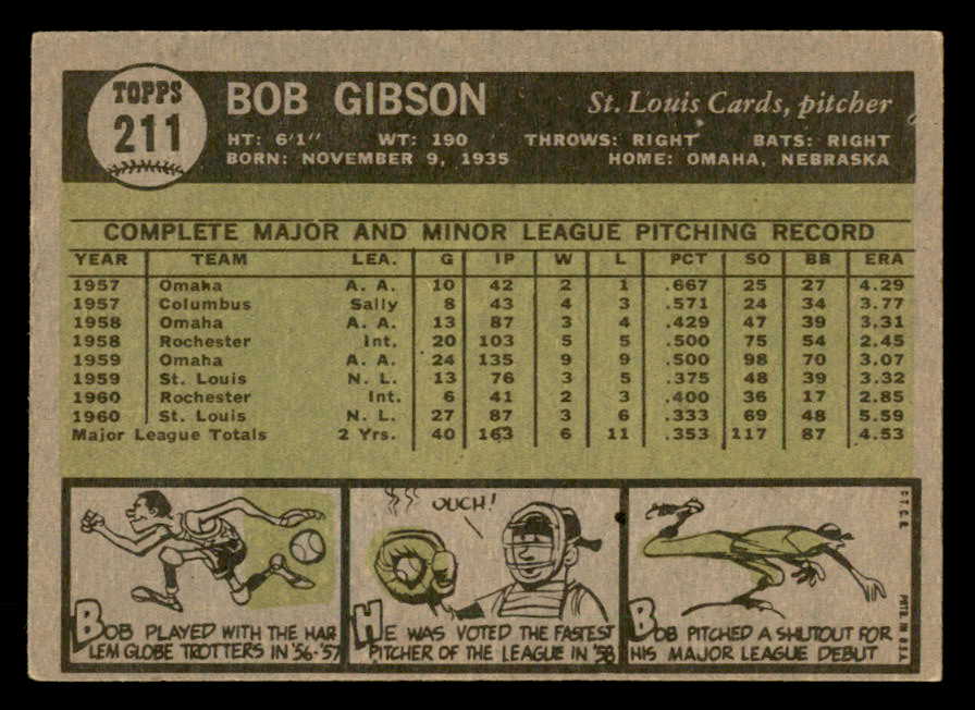 1961 Topps Baseball #211 Bob Gibson Cardinals EX+/EX-MT 547092