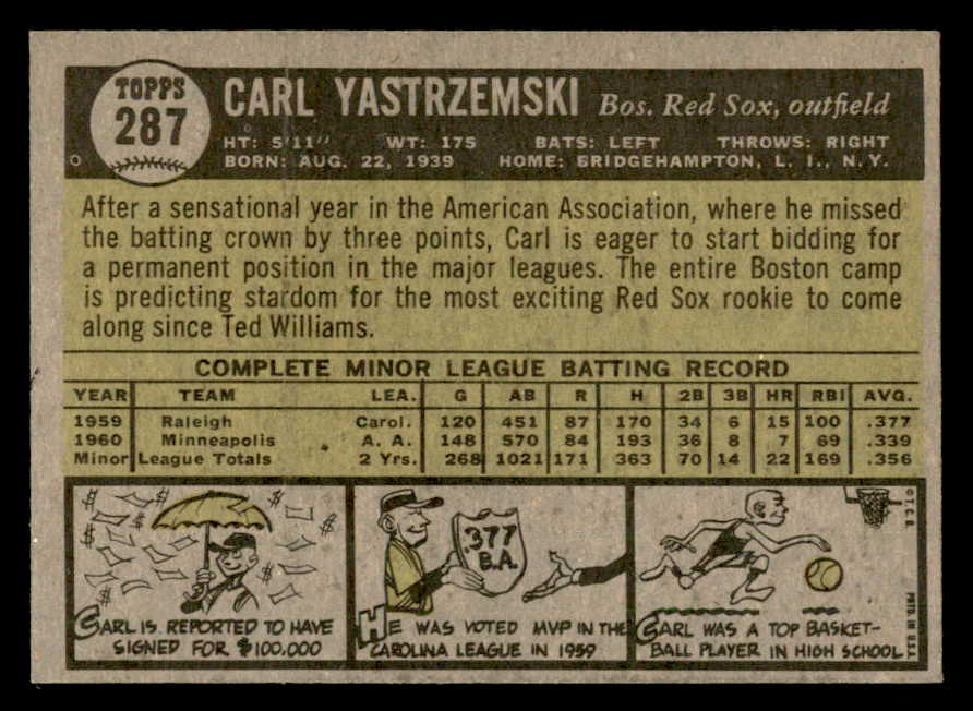 1961 Topps Baseball #287 Carl Yastrzemski Red Sox EX-MT 547096