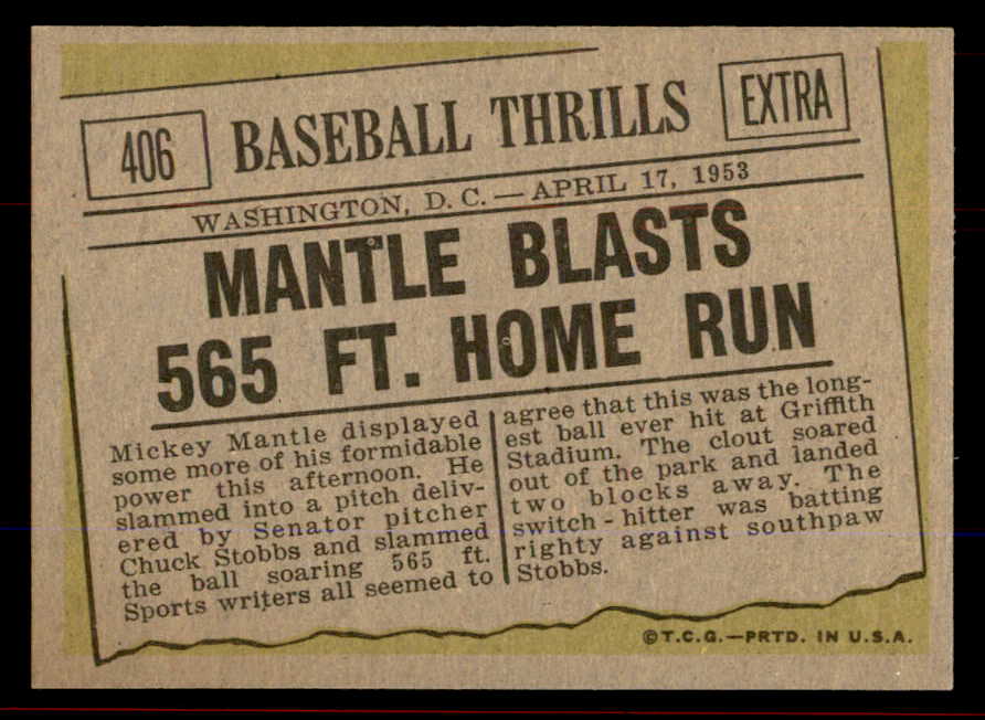 1961 Topps Baseball #406 Mickey Mantle IA Yankees EX-MT 545735