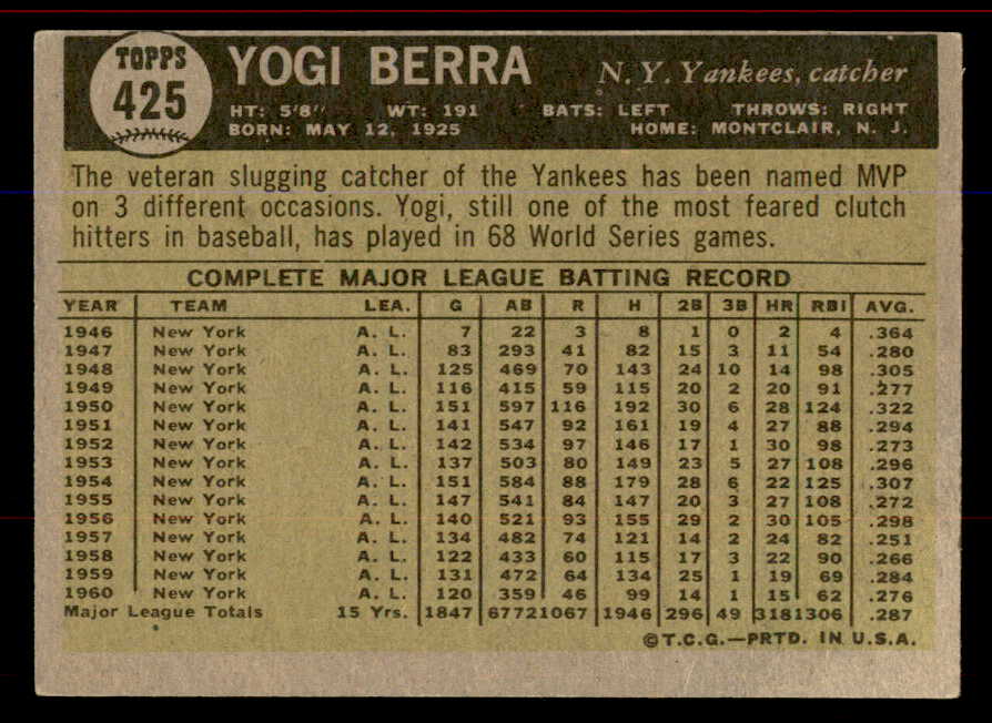 1961 Topps Baseball #425 Yogi Berra Yankees EX+/EX-MT 545746