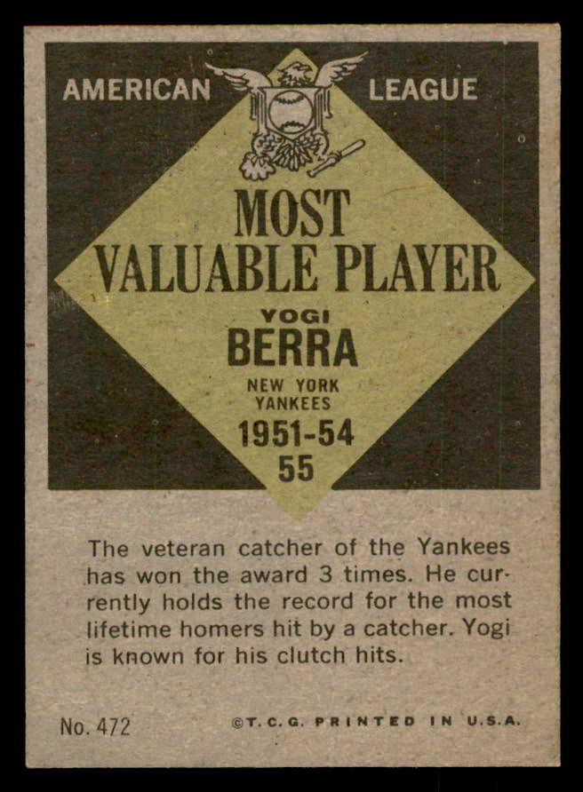 1961 Topps Baseball #472 Yogi Berra MVP Yankees EX-MT 547111