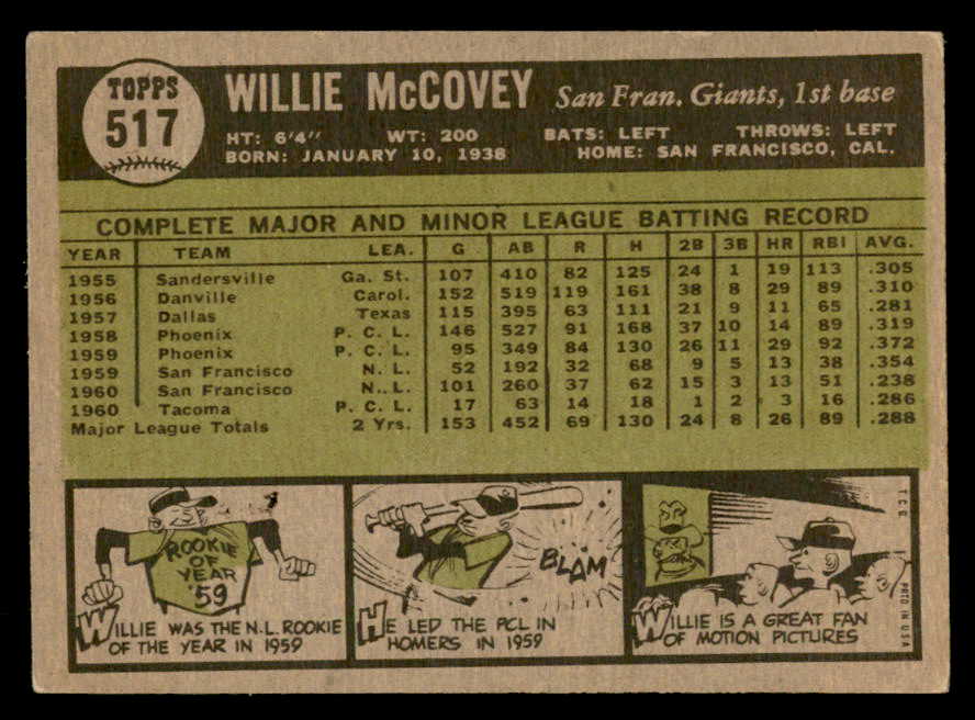 1961 Topps Baseball #517 Willie McCovey Giants EX 547091