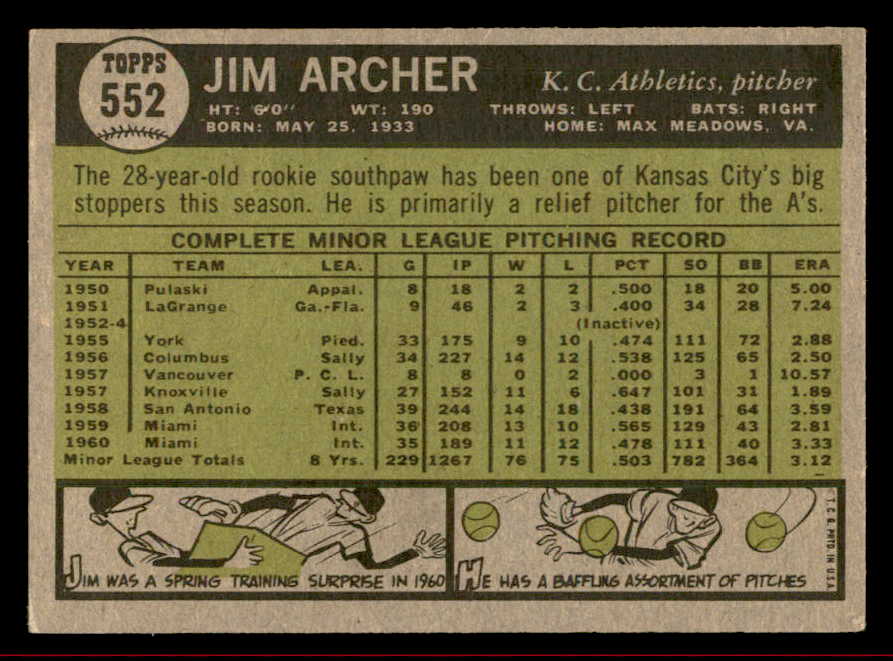 1961 Topps Baseball #552 Jim Archer A's VG-EX 542804