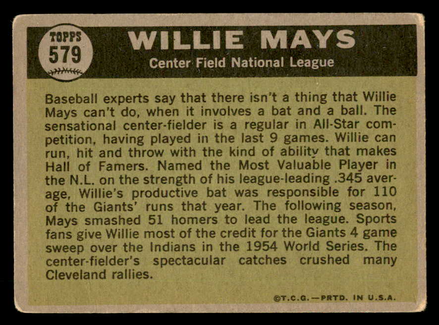 1961 Topps Baseball #579 Willie Mays A.S. Giants VG 547087