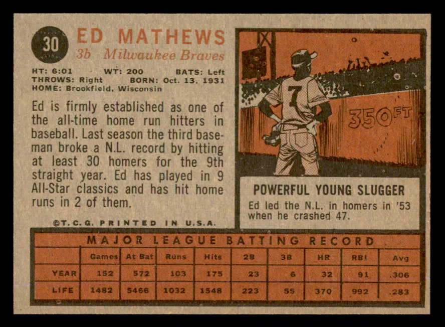 1962 Topps Baseball #030 Eddie Mathews Braves EX 540498