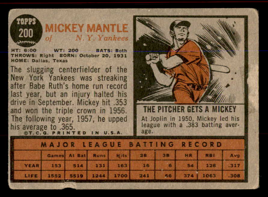 1962 Topps Baseball #200 Mickey Mantle Yankees GD-VG 545485