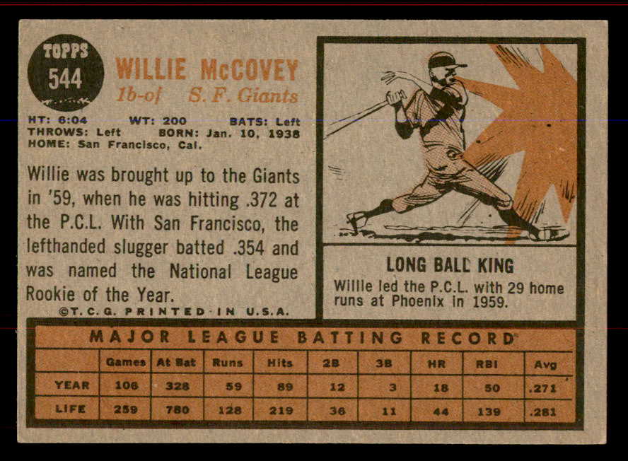 1962 Topps Baseball #544 Willie McCovey Giants VG-EX 545706