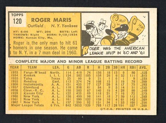 1963 Topps Baseball #120 Roger Maris Yankees EX 542056