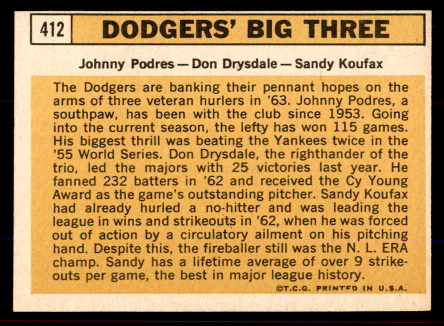 1963 Topps Baseball #412 Sandy Koufax Don Drysdale EX-MT 545571