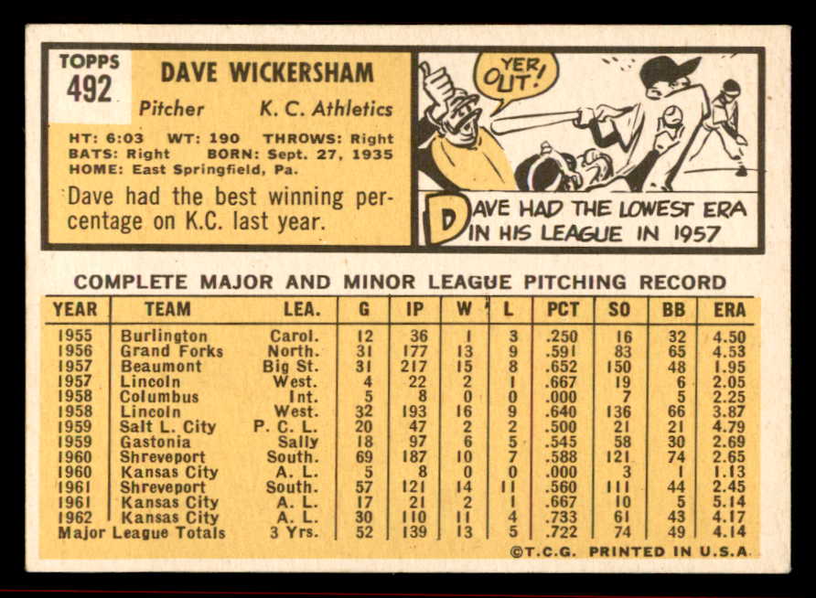 1963 Topps Baseball #492 Dave Wickersham A's NR-MT 542874