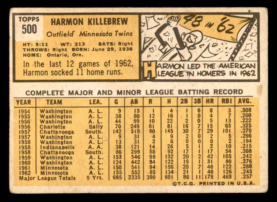 1963 Topps Baseball #500 Harmon Killebrew Twins VG 540613